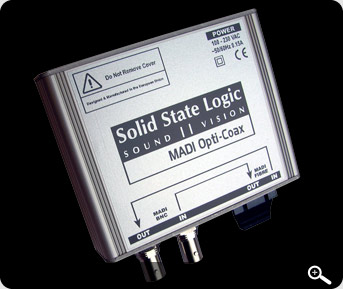 de SSL MADI Opti-Coax, een kleine formaatconvertor waarmee tot 64 kanalen MADI bi-directioneel omgezet kunnen worden.